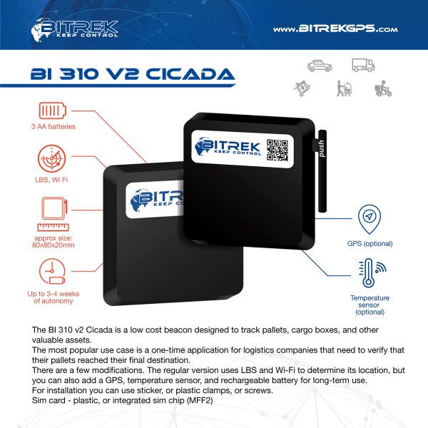 The BI 310 v2 Cicada is a low-cost beacon designed to track pallets, cargo boxes, and other valuable assets.
